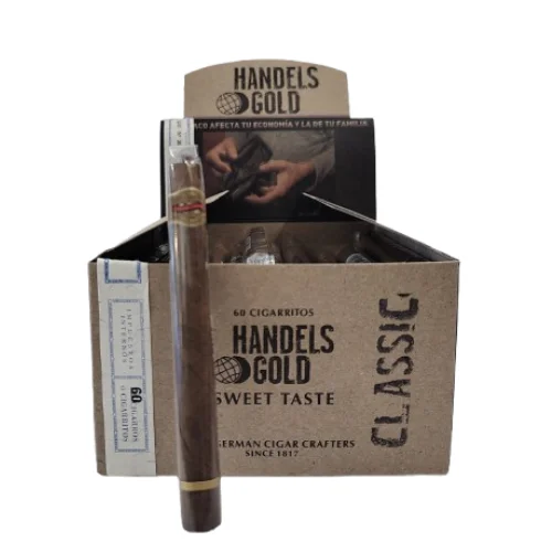Los cigarrillos Handelsgold son puritos (cigarritos) alemanes de alta calidad y precio asequible, elaborados con tabaco rubio seleccionado y saborizados, ideales para una fumada rápida, con un tamaño aproximado de 10 cm de largo.